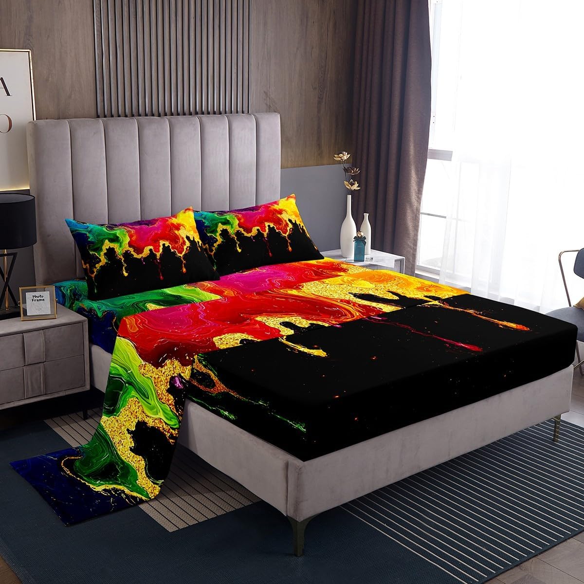 We Have Been Listening to The Opinions of Our Customers From The Reviews,So We Developed a New Bed Sheet Set and Added Flat top Sheets to Meet The Needs of More People.Our Bedroom Decor Bed Sheets Set Look with The Vivid Stylish and Elegant Print Bedding Set. Size Information Twin Size Includes: 1 Pillowcase(20”x30”) and 1 Fitted Sheet(39”x75”x16") and 1 Flat Sheet 96x66" Full Size Includes: 2 Pillowcases(20”x30”) and 1 Fitted Sheet(54”x75”x16") and 1 Flat Sheet 96x81" Queen Size Includes: 2 Pillowcases(20”x30”) and 1 Fitted Sheet(60”x80”x16") and 1 Flat Sheet 102x90" King Size Includes: 2 Pillowcases(20”x35”) and 1 Fitted Sheet(78”x80”x16") and 1 Flat Sheet 106x90" Materials: Luxuriously Brushed Microfiber Fabric Fabric and Design: Silky Soft Brushed Microfiber Cotton Feel Material Bed Set Bedding Set Fashion forward Inspired 3D Print Patterned Technique Flat Fitted Sheet Top Sheet Features: Luxuriously Soft Feel for a Great Night Sleep with Less tossing and Turning Just The Right Fill to Keep You Warm In The Winter and Comfortable In The Summer Built to Last with Premium Fabrics and Expert Stitching Care Instructions Dry Clean Preferred.Machine Washable,Use Front Loader Machine(Or top Loader without Agitator)to Avoid Tearing,Use Cold Water on Gentle Cycle,Tumble Dry Low.