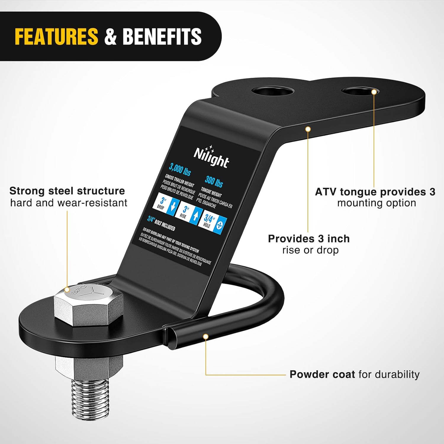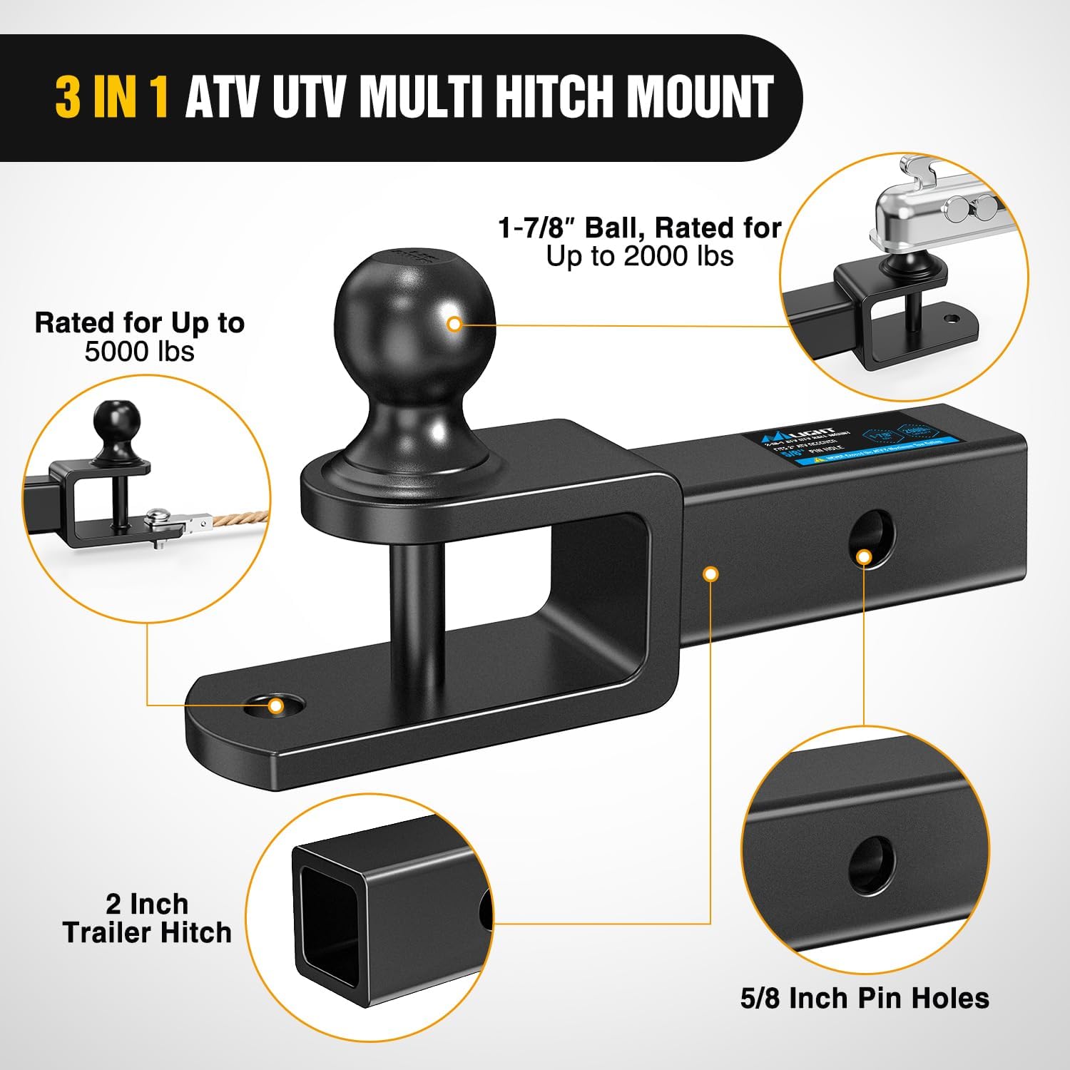 Nilight 3 in 1 Multi Hitch Mount with 2inch Ball Hitch Fits 1-1/4 Inch Receiver1.Heavy Duty Trailer Hitch: 2-inch BallHitch Rated 2000 LBS, Winch Strap Loop Rated 5000 LBS. Perfect for towing trailer,campers, hauling motorcycles and ATVs with 1-1/4 inch standard hitch receiver2. Product Dimensions: This trailer hitchball mount comes with a 1-1/4 inch x 1-1/4 inch shank to fit virtually anyindustry-standard 1-1/4 inch receiver. Includes a 2 inch ball, 1 1/4 inchshank, 5/8-inch pin hole, 1/2 inch hitch pin and a bridge pin3. Corrosion Resistance Finish: Two stagefinish using E-Coat pre-coating and high-grade textured black powder coatingfor long lasting corrosion resistance4. Easy to Install: Easily mounts to yourATV or UTV hitch receiver to provide a hitch ball, winch strap loop and5/8-inch pin hole for yard work equipment, utility trailers and other towableaccessories5. High applicability: The utility of thistowing accessory makes it ideal to tow and haul boats, trailers, campers,livestock trailers, recreational vehicle trailers, dirt bikes, ATVs,motorcycles and more